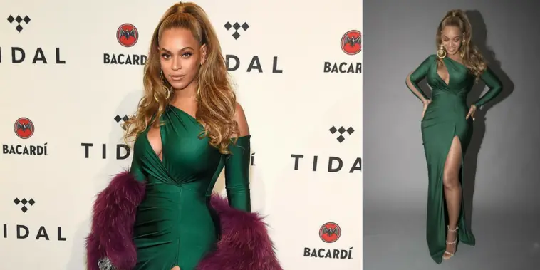 Lending her support to her baby daddy Jay Z’s music streaming company, Bey channelled old Hollywood in the bardot one-shoulder design.